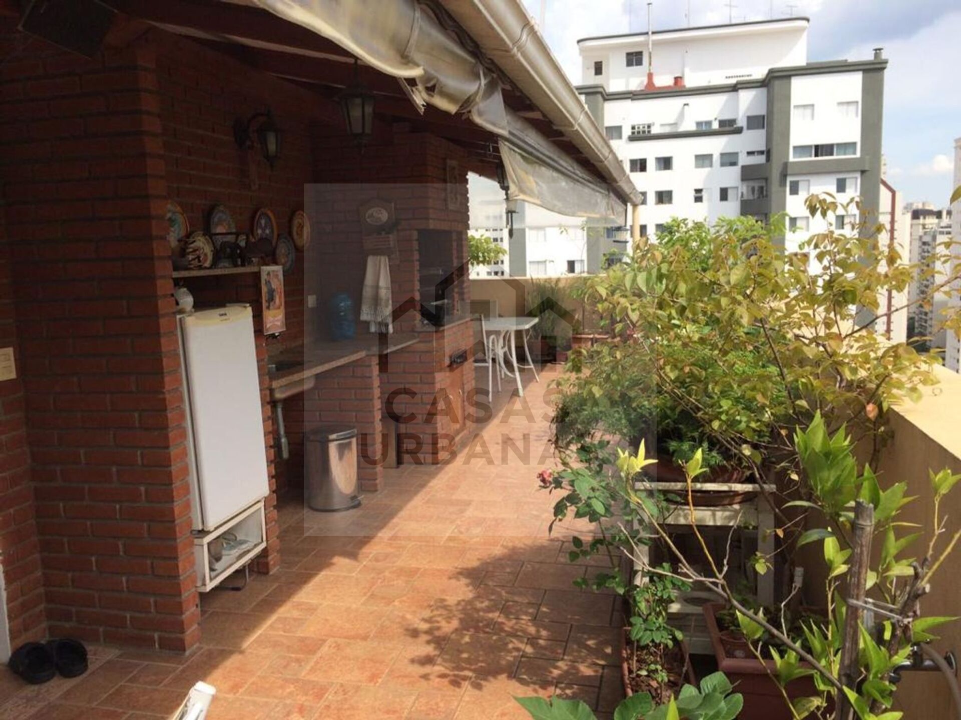 - Varanda ampla em U, com churrasqueira coberta, tem parte coberta e parte área descoberta, mas com toldos para dias de chuva, área para várias mesas;